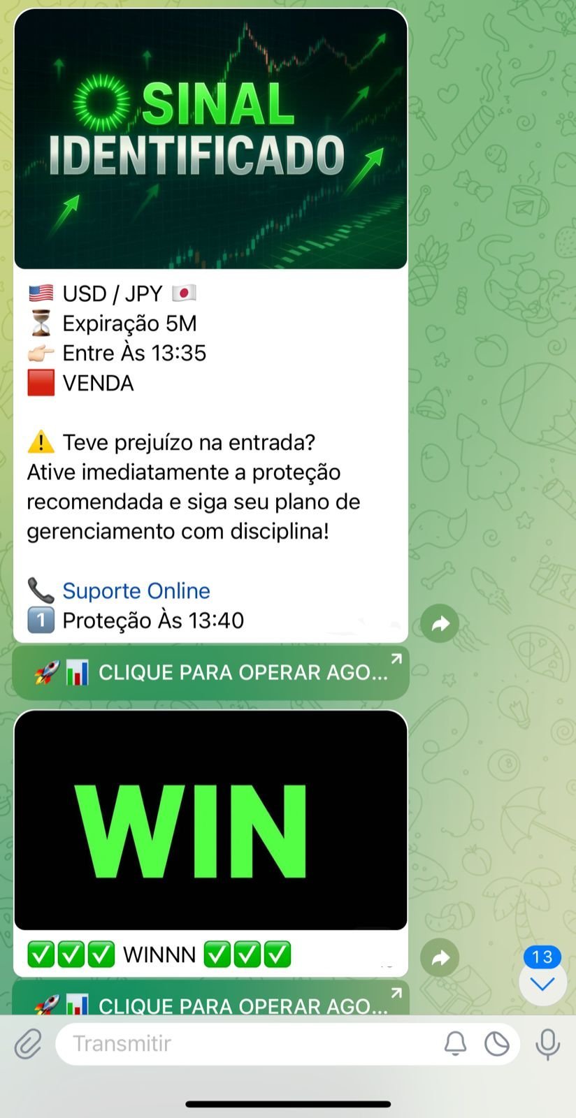 Todos os sinais são enviados diretamente no Telegram, em tempo real, para que você possa entrar na operação no momento certo.